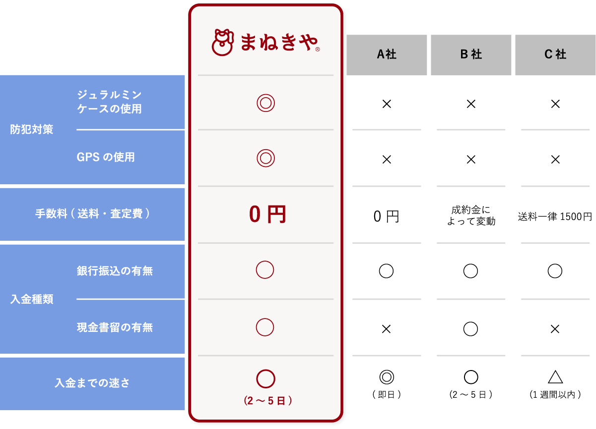 送料のお客様ご負担はございません。査定金額にご納得いただけなかった場合も当社負担にてお品物をご返送いたします。